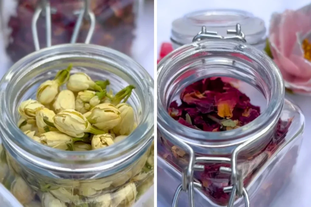 - Dried rose petals & jasmine flowers: Look on Amazon, Etsy, Mountain Rose Herbs, or check your local health food store. Always buy cosmetic or food-grade dried flowers.