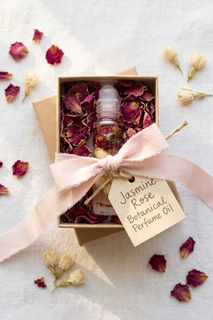 For a visually beautiful gift, place the roller bottle inside a small kraft box with a few dried rose petals scattered around it. Add a handwritten tag with the perfume name like “Jasmine Rose Botanical Perfume Oil.”
